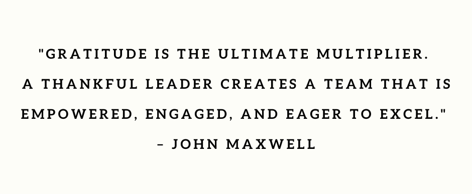 4. Say It Out Loud – This might sound obvious, but don’t underestimate the power of simply telling people you’re grateful. Whether it’s in a one-on-one meeting, a group setting, or a personal note, take the time to express appreciation. Leadership can be lonely, but your team doesn’t know you value them unless you actually tell them!